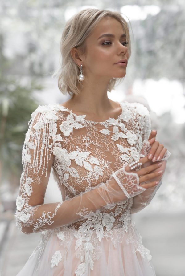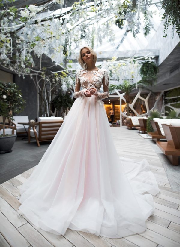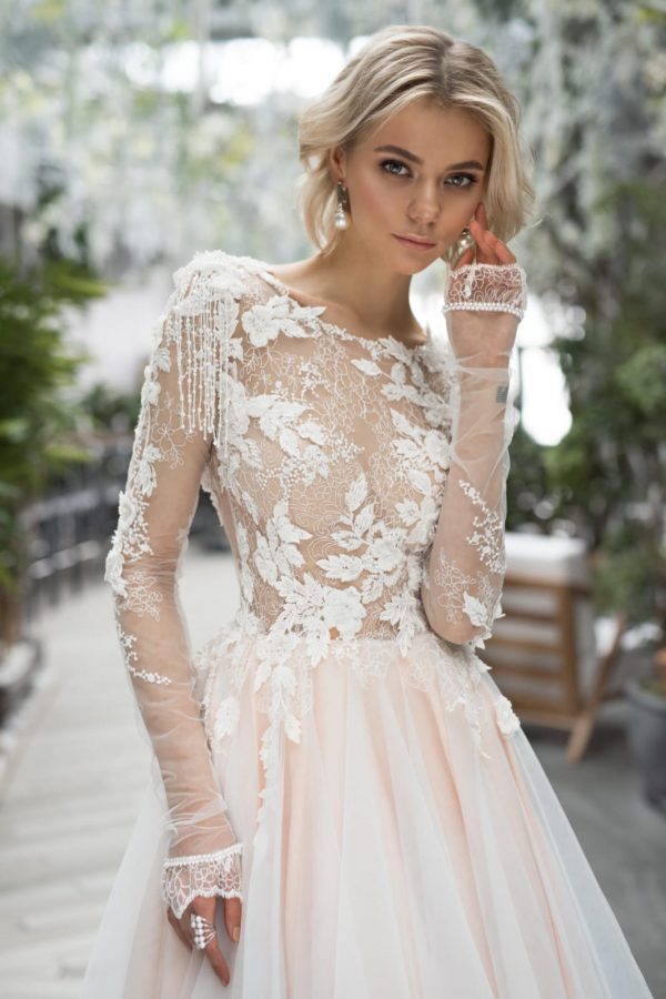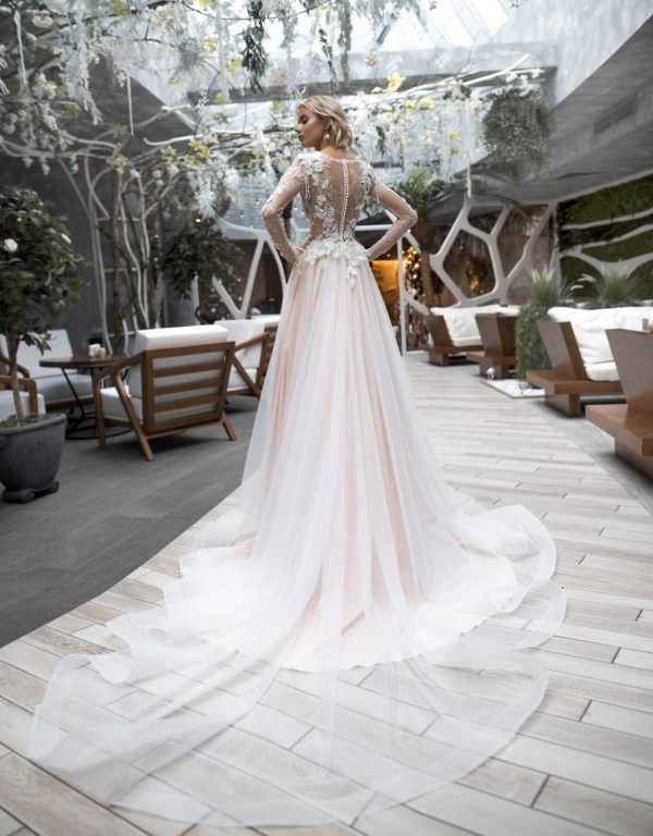 Sensacional vestido con una falda espectacular en tul de seda rosada, muy ligera y vaporosa, decorada con aplicaciones de encaje en el cuerpo y en las mangas largas de tul ilusión con detalles florales que trepan por la espalda. Vestido con mucha luz y transparencias . Disponible en dos colores: rosado y blanco roto.